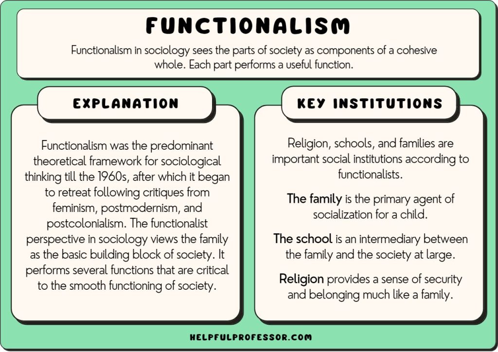 Usage: This sociological framework views society as a structure with interrelated parts designed to meet the biological and social needs of individuals in that society. It can guide programs aiming to optimize social systems to serve communities better.